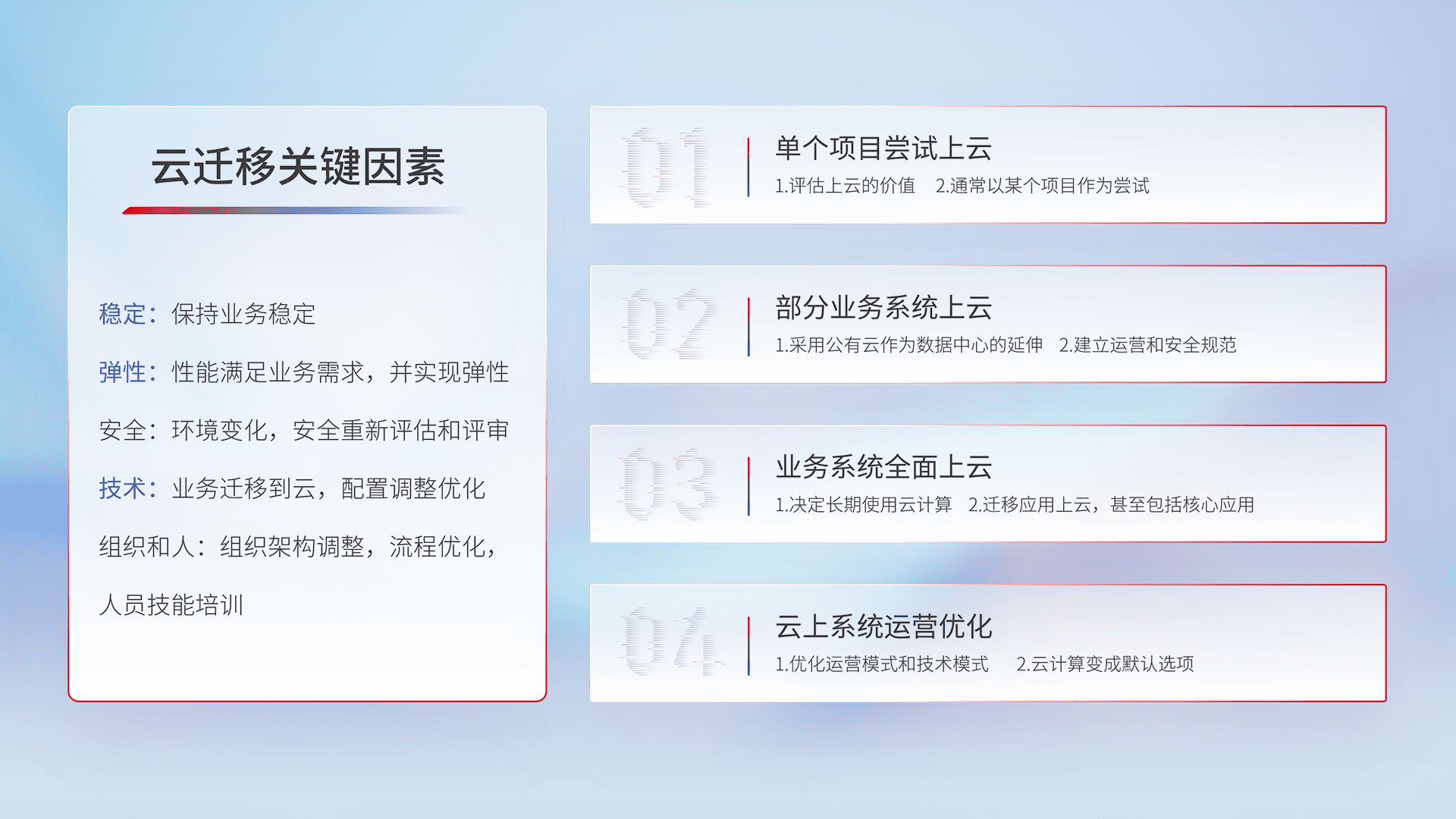 结合实际业务,,从规划设计、、云平台选型、、云原生改造、、、、数据迁移、、、集成交付,,,,迁移全过程为客户识别最佳上云路径,,,做好风险识别管理,,设计网络架构、、、、身份权限、、、、安全审计合规、、操作审计、、、日志审计、、、、监控告警策略、、、多站点容灾设计等,,,对云上基础设施进行整体规划,,,提升IT治理水平,,,,以满足弹性、、、、高可用、、、高性能的需求。。。。