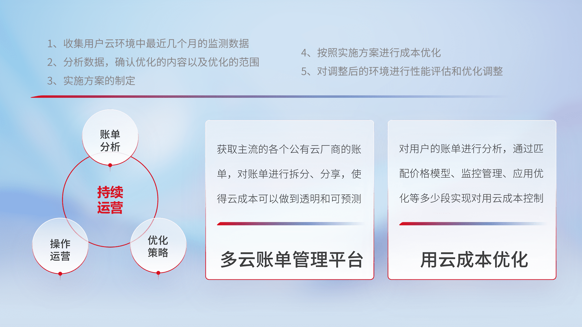 通过多云纳管,,,以统一的资源数据模型把客户的云资源进行抽象和封装,,,进而实现对多云资源的统一操作,,保障云资源管理的可靠性、、、、稳定性与可用性。。。。量身定制化运维内容,,配置、、、开发运维、、、、补丁管理、、、、备份、、监控、、、、认证和访问管理、、、、审计和日常巡检等,,保障在用云过程中的可靠度,,,,稳定度以及高可用率。。。。
